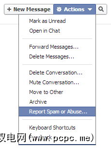 如果您收到聊天或私人消息,则可以执行相同的操作。转到相应的邮件,然后从操作菜单中选择报告垃圾邮件或滥用行为... 。