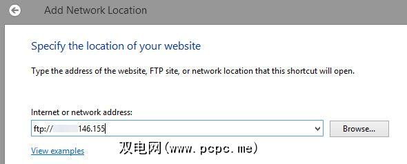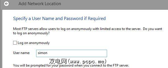 选择输入自定义网络位置,然后输入您的FTP服务器的网络地址。这是IP地址,前缀为“ ftp://"(不带引号)。在下一个屏幕中,您可以选择输入用户名(如果您不是匿名连接)。