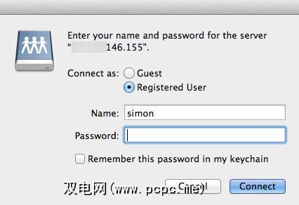 在下一个窗口中,将要求您输入用户凭据。如果您遵循前面的说明,您的用户名将已经填写。只需输入密码,然后再单击一次 Connect 。如果您没有用户凭证(服务器不需要您),请选择以访客身份连接以匿名方式登录。