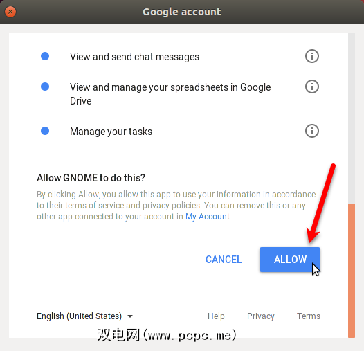 单击允许,以允许文件管理器Nautilus访问您的Google帐户。