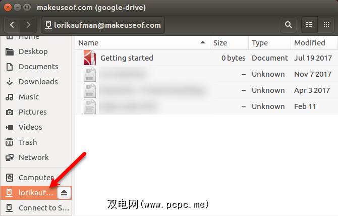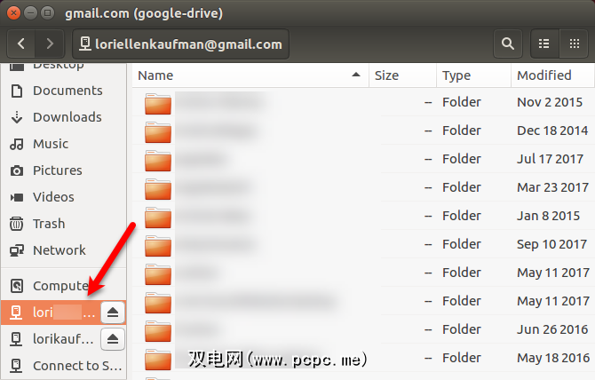 现在,您可以直接在Nautilus中访问Google云端硬盘帐户。您的帐户已安装在Nautilus中,并在左窗格中显示您的Gmail地址。单击您的电子邮件地址以访问您帐户中的文件。