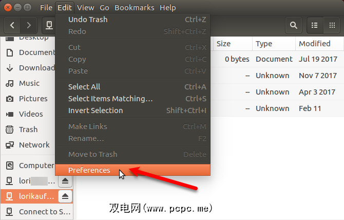 默认情况下,Nautilus不会从安装的远程帐户加载文件预览或缩略图。但是,您可以更改此设置。在Nautilus中,转到编辑>首选项。