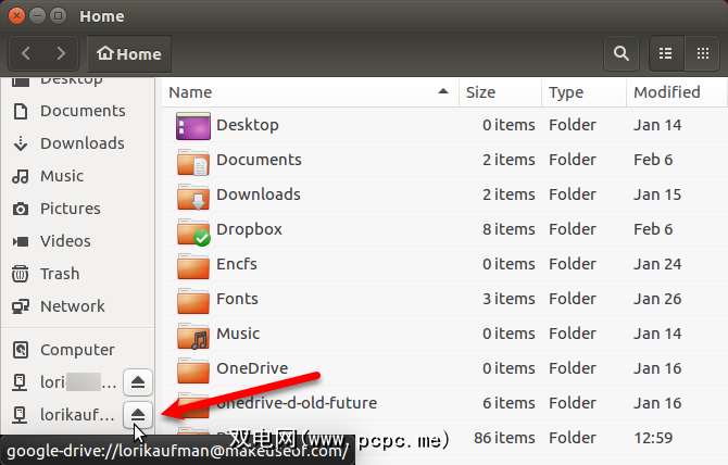 要卸载Google云端硬盘帐户,请单击Nautilus中Gmail地址右侧的弹出图标。