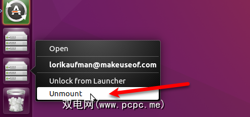 您也可以卸载Unity Launcher上的Google Drive文件夹。右键单击要卸载的帐户的已安装驱动器图标。然后,选择卸载。