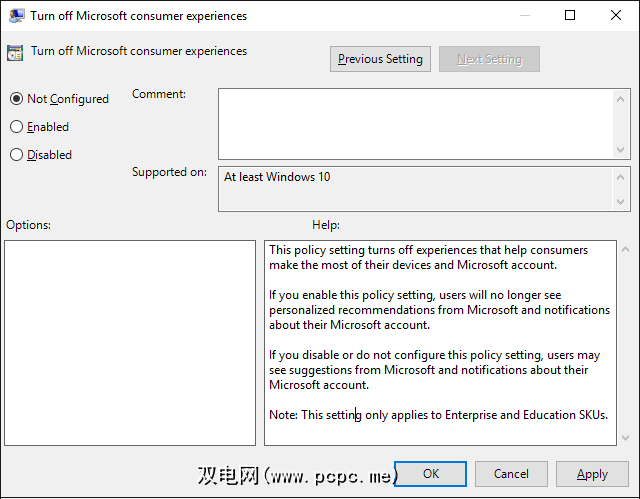 Microsoft Consumer Experience将个性化建议和Microsoft帐户通知带到您的桌面。这包括安装第三方应用程序(如Candy Crush)以及“开始"菜单中的活动图块,这些活动图块链接到Windows应用商店中的第三方应用程序。