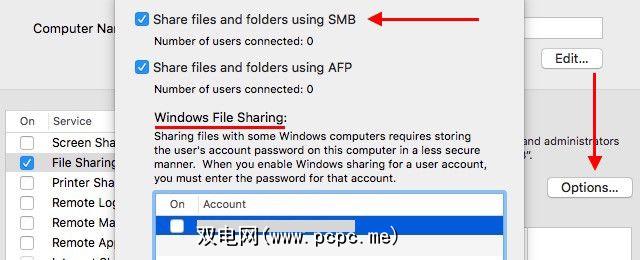 在下> Windows文件共享,请选中您的用户帐户名称旁边的框以启用文件共享功能。点击完成退出选项对话框。您也可以关闭系统偏好设置对话框。