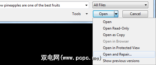 首先,打开相关的Office程序,然后转到文件>打开。然后找到损坏的文件,选择它并使用打开下拉箭头选择打开并修复... 。这种方法并不总是最可靠的,但是如果损坏很小那么您可能会在其中找到成功。