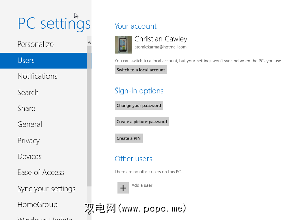The first step is to ensure you have a Windows Live account setup on your computer. If you installed Windows 8 and opted for a local account don’t worry – you can configure a new account by clicking or tapping in the lower-right corner of the Start screen, selecting Settings then Users > Add a user.