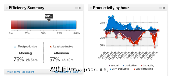 Mac Data Collector图标位于菜单栏中,这是一种方便的方法,可单击到RescueTime帐户页面的仪表板。在那里,您将获得所有相关计算机活动的概述,即一天中的哪些时间生产力最高,生产力最低,并且“ 效率摘要"报告了您的生产时间与分散时间。