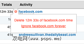 在活动页面下,您还可以选择删除单个活动或让RescueTime完全忽略受监视和报告的网站或应用程序。例如,我让RescueTime忽略了Facebook(默认情况下,Rescue将其标记为“干扰"),因为我从未访问过该网站,但我的女儿却访问了该网站。要找到“删除/忽略"按钮,您必须将鼠标光标悬停在列出的时间附近以显示活动,以便活动出现。
