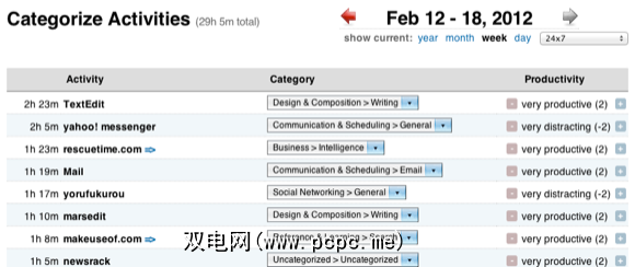 虽然RescueTime可能会将您在Twitter或PCPC.me上花费的时间标记为分散注意力,但您可以另外指明。在使用RescueTime几个小时后,您可以点击“设置"菜单下的“ <活动>分类活动",然后将您认为哪些活动设置为“ <高效率"。 “非常分散注意力",或者介于两者之间。