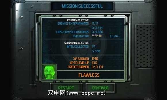 成功执行任务将获得一个祝贺画面(如上所示),其中您的表现将得到总结,并获得积分和XP 。在两次任务之间,您将返回到玩家状态屏幕,在这里,您可以检查获得了哪些成就并升级了角色(只要已经获得了足够的XP)。