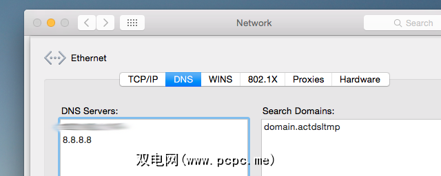 转到Mac的“偏好设置"面板,然后单击“网络"。单击左侧面板中的当前连接,然后单击右下角的“高级"按钮。单击“ DNS",您将看到以下屏幕: