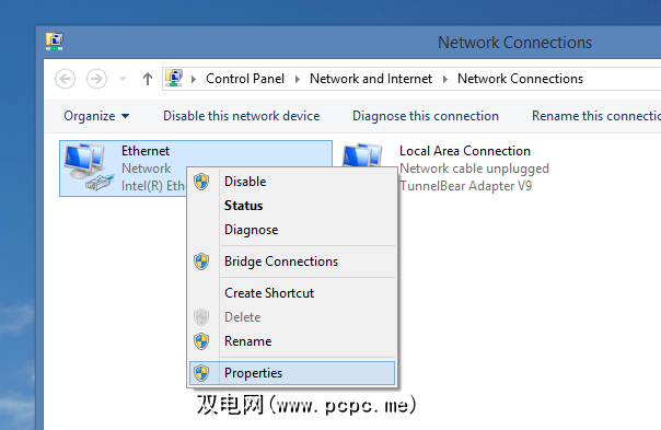 转到控制面板,然后找到“更改适配器设置" "。右键单击您当前正在使用的任何连接,然后单击“属性"。