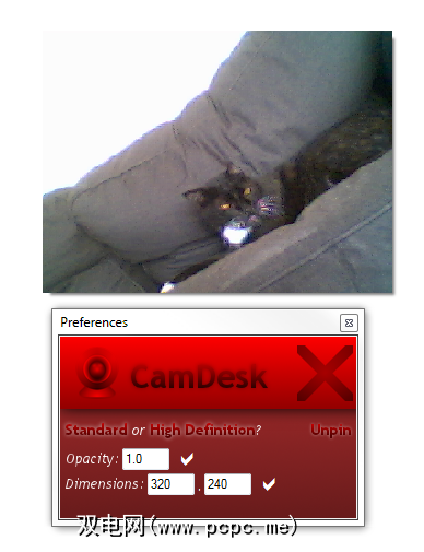 这是Bibi,我的年纪大的猫正试图使用其他网络摄像头来追踪。首选项窗口虽然在视觉上不那么吸引人,但提供了一些有用的选项。在这里,您可以固定和取消固定视频窗口,以使其保持在顶部或充当任何旧窗口。您还可以根据自己的需要更改视频的尺寸,并更改视频的不透明度。