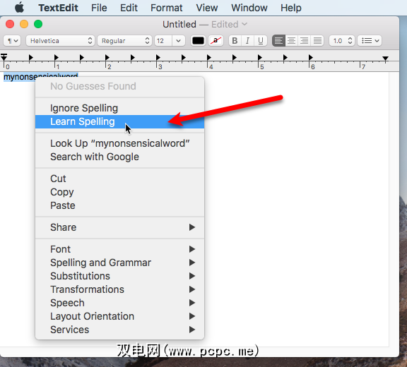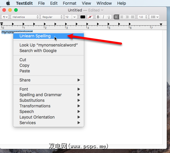 要从内置词典中删除单词,请打开新的TextEdit文档,然后键入要删除的单词。再次,不要在单词后添加空格。