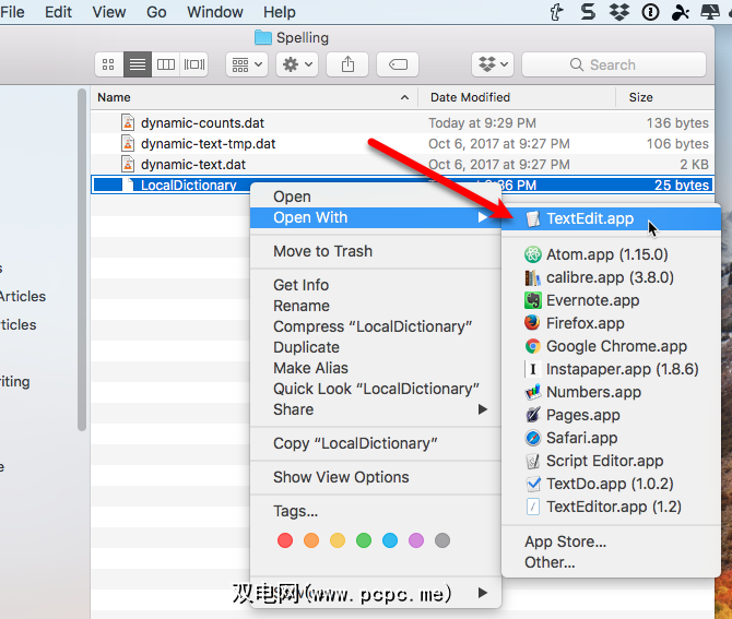 在 Spelling 文件夹中,右键单击 LocalDictionary 文件,然后转到打开方式> TextEdit.app 。
