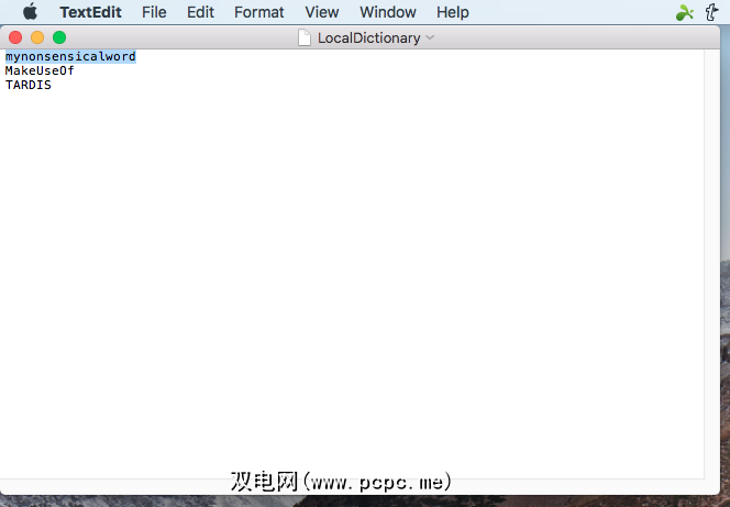 LocalDictionary 文件在TextEdit中打开。每个单词都显示在单独的行上。您可以像编辑任何其他文本文件一样编辑这些单词,添加更多单词和删除单词。