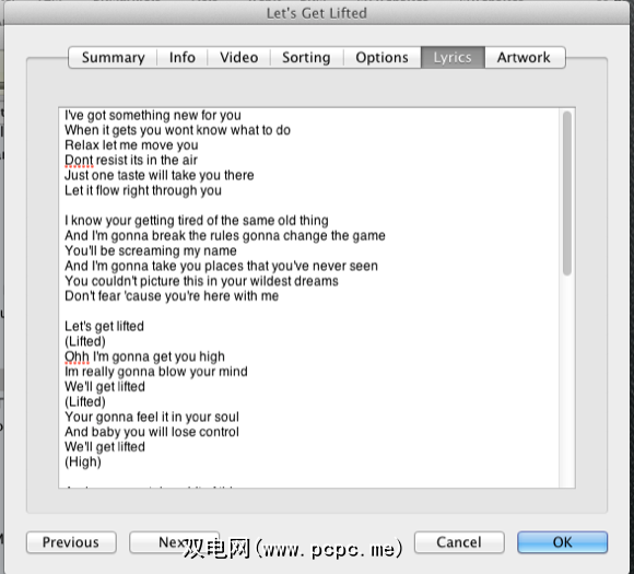 使用Google Lyric Search,您必须将歌词复制并粘贴到iTunes中。为此,您只需右键单击或按住Control键单击选定的歌曲(或使用Command + I),然后单击“信息"窗口的 Lyrics 部分。将歌词粘贴到那里。