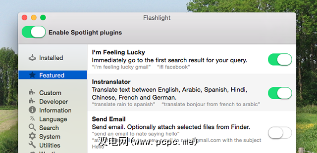 启动手电筒,您将看到一系列开关。首先点击“启用Spotlight插件",然后浏览所有内容并打开您感兴趣的任何内容。