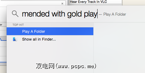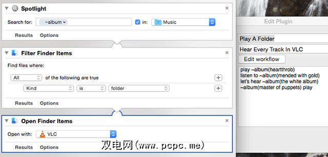 自动脚本位于左侧-使用我在Spotlight中键入的内容(我使用变量〜album),在音乐收藏中搜索文件夹。第二步将结果缩小到仅文件夹,第三步在VLC中打开文件夹。