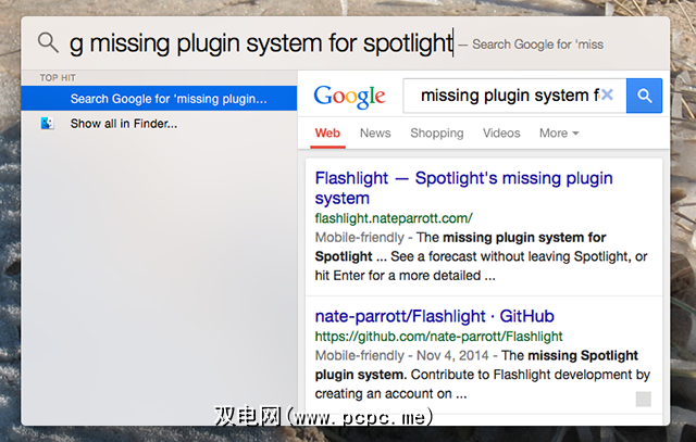 您对听说优胜美地的Spotlight会包含来自主要搜索引擎的结果,但当您发现它是必应时才感到失望吗?好消息:您可以重新使用Google。一个名为“ Web搜索"的Flashlight插件可让您只需键入“ g"和您的搜索字词即可快速查询Google。
