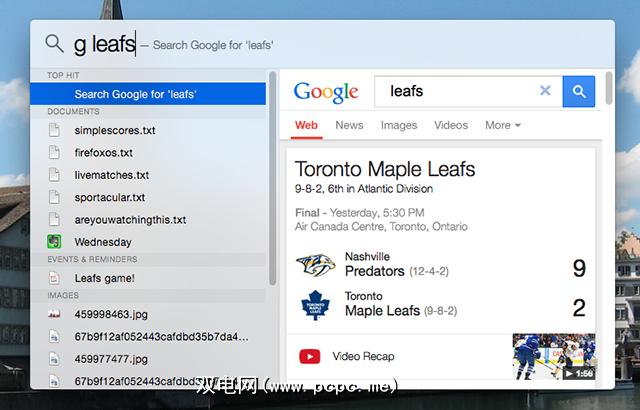 您可以点击“ Enter"在浏览器中打开相同的搜索,或单击任意结果。请注意,默认情况下会弹出很多不同的信息。 Google结果-例如地址和电话号码,甚至是运动成绩。如果您是Leafs的粉丝(就像我一样),则可以通过键入“ g Leafs"来了解悲伤的最新原因。