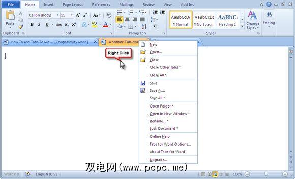 尽管它是功能有限的版本,但Office Tab却为您提供了更多有用的(可自定义的)选项。您可以在标签栏上的任意位置单击以快速打开新文档。您也可以右键单击标签栏以选择 New 或 Open 来打开另一个文档。您也可以从此处关闭或保存文档。 (标有星号的功能仅在该应用的商业版本中可用。)