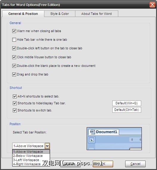 Office Tab支持的每个程序(免费版中的Word,Excel和PowerPoint)都有一个设置面板,您可以在其中使用更多选项。可以针对每个应用程序个性化设置。在安装过程中也会显示设置面板。变灰的选项仅保留给该插件的商业版本。