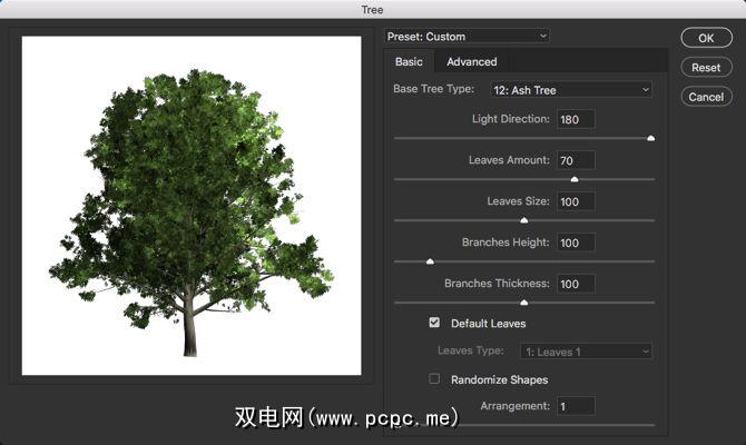 调整大小并移动树层,使其自然地适合图像。 “树"对话框是强大的自定义功能包。例如,您可以使用光的方向,树叶的数量,树叶的颜色和树叶的大小在背景图片中模拟季节。