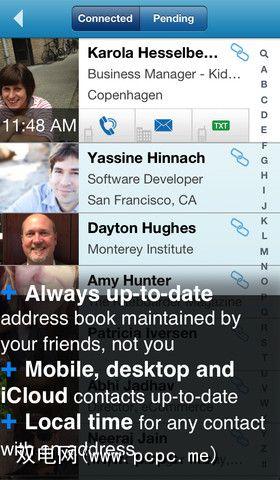 工作方式非常简单。您安装该应用程序,并授予其访问您的地址簿的权限。然后,您就可以和您的朋友(想要保持联系的详细信息)一起安装该应用并添加您。一旦您需要的每个人都安装并通过该应用程序与您建立联系,其余的工作就会由您来完成。每当您或您的朋友更新他们的联系信息(电话,地址,生日等)时,此信息将在所有互连的通讯簿中自动更新。就这么简单。您不需要注册甚至不用Facebook帐户登录。