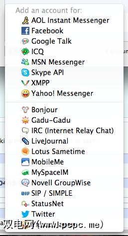 让我们首先指出Adium优于iChat /的主要优势。消息–它支持所有内容。苹果公司的默认聊天客户端支持AIM,Yahoo和Jabber,而Adium则内置了对一长串客户端的支持: