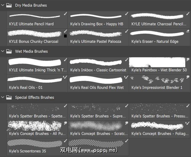 在新的画笔中面板上,您可以看到所有已安装的刷子(包括您自己定制的刷子)。 Photoshop CC 2018还允许您访问由Kyle Webster创建的新画笔。新的画笔包括干介质,湿介质和特殊效果画笔。 Adobe还提供了许多其他免费画笔。
