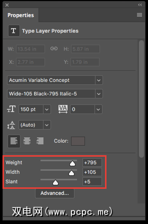 这是新的“属性"面板将派上用场的地方。选择您的文本,然后拉出“属性"面板(窗口>属性)。然后使用滑块调整每个设置。