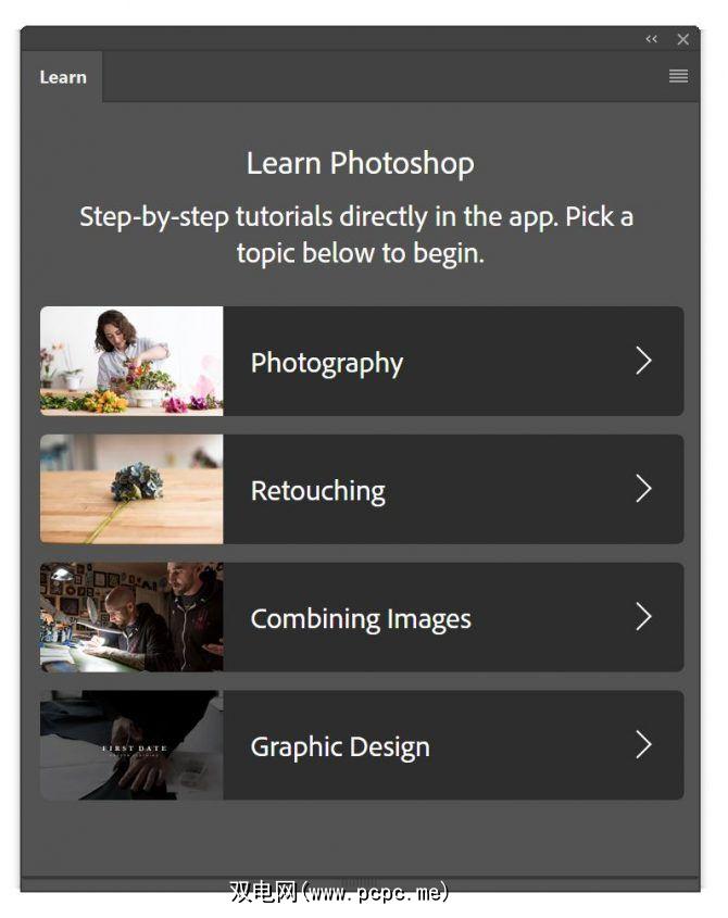 Photoshop CC 2018引入了一个名为学习面板的全新面板。要打开它,请转到 Windows>学习。这个新面板非常适合刚开始使用Adobe Photoshop的新手。最初,该软件可能会让人不知所措,并且此新功能使用户有机会无需离开Photoshop就可以学习如何使用该程序。