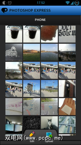 这些是我手机上图像的缩略图。但是它们没有分成相册,而且,更糟糕的是,默认情况下会丢失许多图像。通过弄乱设置,我终于可以使Photoshop Express索引手机中存储的所有照片,但是默认情况下,它仅包含有限的子集。我选择了要编辑的照片,并希望对它的界面进行调整。