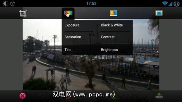 顶部的工具栏是执行所有操作的地方。您可以进行裁剪,调整图像设置(曝光,饱和度,色彩和其他),应用柔焦效果,最后应用色彩效果和框架。所有人都猜测为什么柔焦会拥有自己的按钮而不是折叠到常规的“效果"选项卡中。编辑子菜单如下所示: