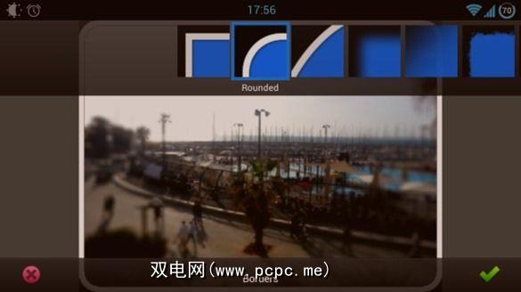 再一次,无法调整框架。您无法控制线条的粗细,拐角半径,颜色或基本上任何东西。您几乎已经陷入了Photoshop Express决定允许的严格预设中。应用后,圆形框架甚至没有PNG透明性:相反,我得到了带有四个黑角的JPG。