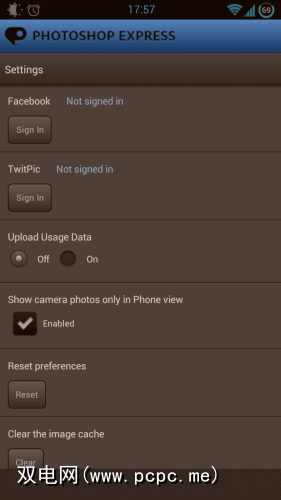 Photoshop Express具有一个单独的“设置"屏幕,几个选项: