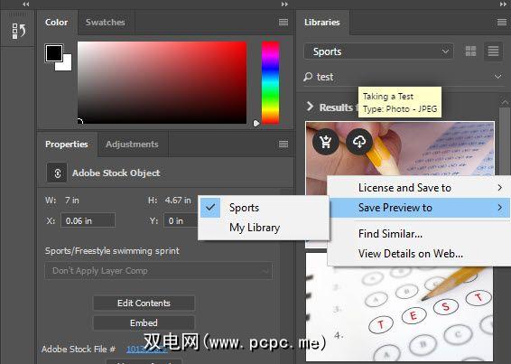 使用下拉框在默认的我的图书馆和您创建的其他图书馆之间切换。您也可以直接从此面板搜索新的Adobe Stock图像。右键单击您喜欢的图像,然后选择保存预览以将水印版本添加到您的收藏中。选择许可并保存到将立即购买完整版本。