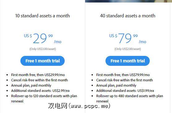 最便宜的计划是按年支付的,每月费用为29.99美元,可购买10个标准资产。如果您需要更多图像,则可以以每月79.99美元的价格升级到40个标准资产计划。如果您没有在给定的月份内使用所有资产,那么这两个计划都将包括12个月的过渡期。