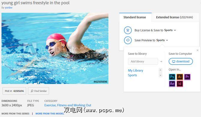 选择图像以查看有关图像的基本信息,例如分辨率,文件类型和类别。 。如果您对图像感兴趣,请选择保存预览。然后,您可以选择将其保存到库中,将低分辨率带水印的副本下载到PC上,或在Adobe编辑应用中打开图像。