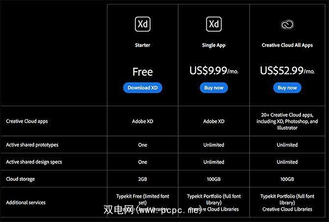 免费版本的其他限制包括有限数量的Typekit字体和2GB的云存储(相对于100GB)(适用于Creative Cloud订户)。如果您决定增加付费版本的现金,那么单独使用此应用程序,Adobe XD每月将花费您9.99美元,而完整的Creative Cloud套件将花费您52.99美元/月。