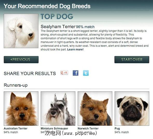 动物星球有一个很好的测验,只需几分钟即可完成。首先询问您要寻找的狗的大小(微小到超大),然后带您解决有关能量,运动,娱乐时间,情感,天气等更多问题。完成测验后,系统将为您展示最匹配的一个品种,以及至少四名亚军。您也可以直接在网站上找到有关该品种的更多信息。