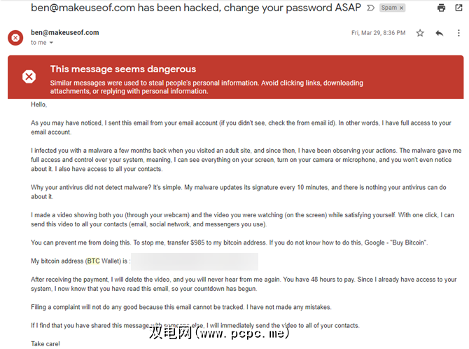 您正在照顾自己的生意,突然从您自己的帐户收到一封电子邮件,表明您的帐户已被黑客入侵。震惊的是,您打开它发现一个惊人的主张:某人在您的计算机上安装了恶意软件,并且在危及环境的情况下为您提供了视频。