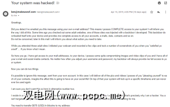 我们收到了两份类似的邮件过去几周的欺诈邮件。每个人似乎都来自您自己的电子邮件地址,并声称攻击者已经通过访问成人网站安装了恶意软件,完全控制了您的系统。