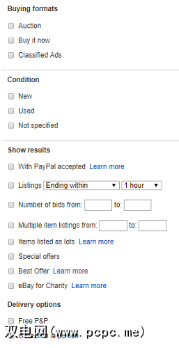 例如,您可以根据商品的条件进行搜索,指定购买格式(拍卖,立即购买,分类广告),选择仅列出卖家而不接受PayPal,确定拍卖剩余的时间,按竞标次数组织结果,指定投放方式等等。