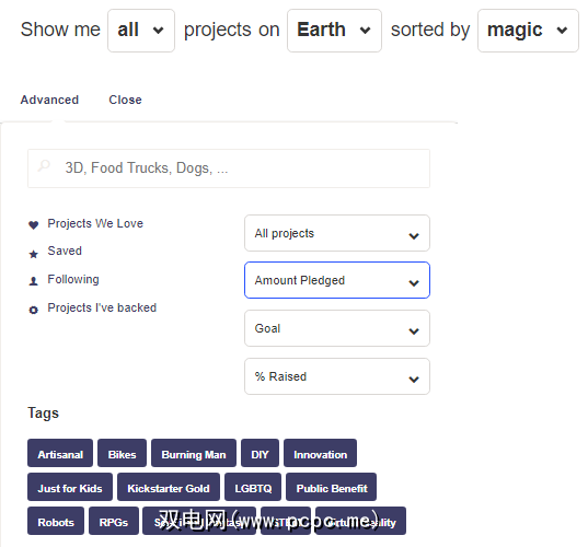 要进一步缩小结果范围,请单击调整搜索>高级。您可以输入项目的位置以及详细信息,例如提高的百分比,承诺的金额和目标金额。感到困惑了吗?我也是。让我们继续前进。
