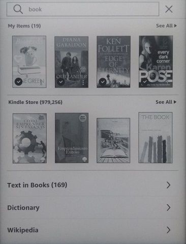 要使用该功能,请点击以下位置的搜索图标屏幕顶部,然后输入搜索词。设备将自动显示排名靠前的结果。要查看更多结果,请按框右侧的小箭头。现在,您可以按书名,Kindle商店和书中的文字进行过滤。您还将看到一个搜索维基百科和字典的选项。