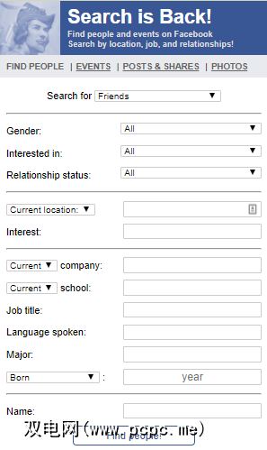 为什么不查看Search is背部?第三方工具提供了更传统的搜索体验:存在诸如性别和关系状态等字段的下拉菜单,以及供雇主,学校等使用的自由格式框。您甚至可以使用页面顶部的标签搜索事件,帖子和照片。您必须登录Facebook才能查看搜索结果。